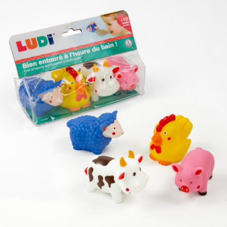 Con estos simpáticos animales de la granja, tu peque no querrá que la hora del baño termine. El set incluye un gallo, una oveja, una vaca y un cerdito. Todos cuentan con un pequeño agujero en la boca para que, al presionarlos debajo del agua, se rellenen.