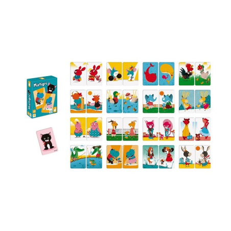 De 2 a 6 jugadores. 33 cartas (7 x 10,5 cm) El objetivo del juego es hacer parejas reuniendo a las familias (papá + mamá + bebé) pero sin quedarse con el gatito negro = el mistigri... porque el que tenga la carta del mistigri al final de la partida habrá perdido.