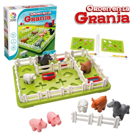 Contenido: tablero con cercado, 4 piezas: 3 vallas, 3 comederos y 8 animales, libro con 60 desafíos y soluciones.