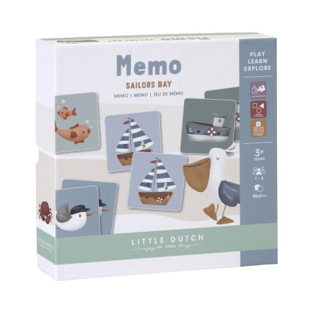 Encuentra el faro, busca la estrella de mar. Este juego de memoria de Little Dutch es tan divertido como educativo. Cada tarjeta está bellamente decorada con una ilustración inspirada en el puerto. Baraja las cartas y colócalas boca abajo sobre una superficie. ¡Colecciona las parejas iguales para ganar! Si lo desea, también puede jugar este juego solo. Memo Sailors Bay les brinda horas de diversión y les enseña a los niños a turnarse. El juego de cartas también entrena habilidades importantes como la concentración y el enfoque.