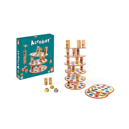 2 a 8 jugadores Lanza los dados y luego coloca tus acróbatas de forma estratégica para crear la torre más alta posible. ¡El primero que la haga caer ha perdido! Contenido: 57 peones acróbatas de madera 20 discos (10,5 x 10,5 cm) 3 dados 1 bolsa de almacenamiento