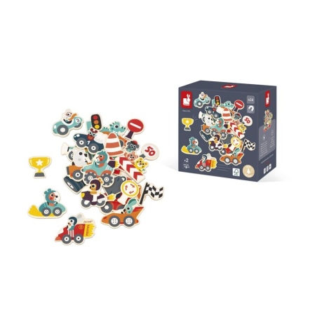 ¡A divertirse! ¡Abrid paso a los coches de carreras! Imaginemos locas carreras con los diferentes vehículos. ¿Ha habido un choque? Que no cunda el pánico, la grúa está lista para intervenir. Nos vemos en la línea de meta para la entrega del trofeo. Este kit está compuesto por 24 imanes de madera que se pueden colocar en pizarras magnéticas o cualquier otra superficie magnética. De esta forma, su hijo podrá desarrollar su imaginación y su destreza mientras se divierte. Juguete magnético de madera FSCTM. Para niños a partir de 2 años.