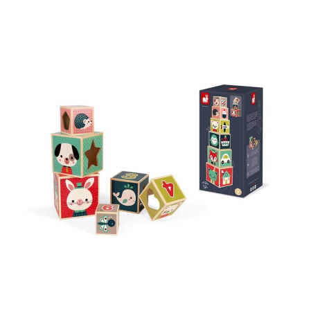 Juguete de madera para niños de 12 a 36 meses. Este juego de construcción, compuesto por 6 cubos encastrables de madera, animará a su hijo a desarrollar su coordinación y su sentido de la observación. Cada cara del cubo está ilustrada sobre un tema diferente: animales, cifras, formas, objetos... Cada cubo posee una cara calada con una forma reconocible (corazón, estrella, triángulo) que dejará ver el animal del cubo encastrado.