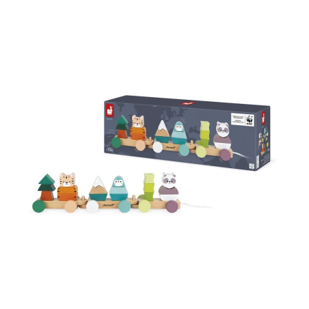 ¡El oso panda, el pingüino y el tigre te esperan para que los lleves de paseo! Juguete 2-en-1: bonitos vagones para tirar de ellos con el cordel de algodón, y juego para apilar de 18 piezas, cada animal debe asociarse con un símbolo de su entorno. Ideal para desarrollar la motricidad fina y el aprendizaje de los colores. Juguete de madera maciza con certificación FSC y pintura al agua.