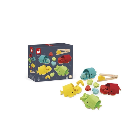 ¡Azul, amarillo o rojo! Hay tantos colores por descubrir. Con la ayuda de las pinzas de madera, el niño tendrá que unir los animales marinos a las ballenas del mismo color. Un juego lúdico y educativo que permitirá al niño familiarizarse con las formas y los colores mientras desarrolla su motricidad fina. Juguete de madera FSCTM. Juguete de estímulo para niños a partir de 2 años.