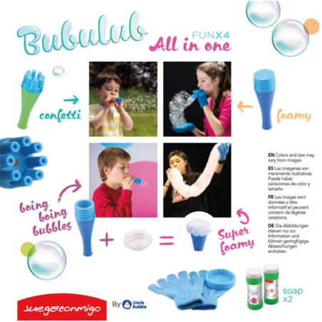 Bubulub All in One Fun x4 incluye cuatro accesorios para hacer diferentes tipos de burbujas y dos guantes que permiten tocar las pompas con las manos sin que exploten inmediatamente y que uno o dos niños puedan jugar con ellas.