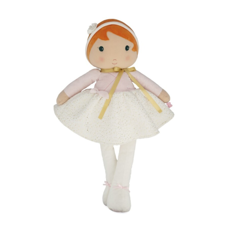 ¡Los abrazos más grandes! La bonita muñeca de tela Valentine ya está disponible en formato de 80 cm. Un tamaño extragrande para decorar una habitación y para que pueda refugiarse el bebé entre sus brazos. ¡Valentine, con un estilo delicado y refinado, es la bailarina de ballet que hace soñar a todos los amantes de la danza clásica! Vestida con un top cruzado de color rosa polvo resaltado con un fular dorado y una falda muy suave con un estampado de estrellas de color champán, Valentine muestra un estilo delicado y refinado. Peinada con un moño acompañado de una magnífica diadema con una flor que es digna de una auténtica bailarina. Su cabello pelirrojo la diferencia de las otras muñecas Tendresse. Adorable y sonriente, siempre estará al lado del niño para reconfortarle y consolarle cuando esté triste, pero también para acompañarle en sus descubrimientos, desde su nacimiento. Todos los materiales se han elegido por su infinita suavidad al tacto y su facilidad de limpieza.