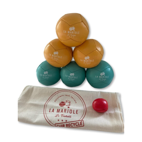 El set incluye: 6 bolas (en 2 colores) de 7,5 cm y 150 gr de peso + 1 boliche + 1 medidor + 1 bolsa Bolas fabricadas de cuero reciclado Hechas de forma artesanal la cantidad de material interior puede variar en un +/- 5% aprox.