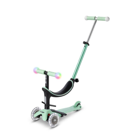 El innovador y ergonómico patinete todo en uno se puede utilizar en diferentes variantes: al principio con asiento, dos opciones de reposapiés y barra de empuje para los padres, posteriormente sin barra de empuje, como una mezcla entre bicicleta de equilibrio y patinete y finalmente como un Mini Micro Deluxe clásico con luces LED mágicas en los extremos del manillar y ruedas lunares LED.