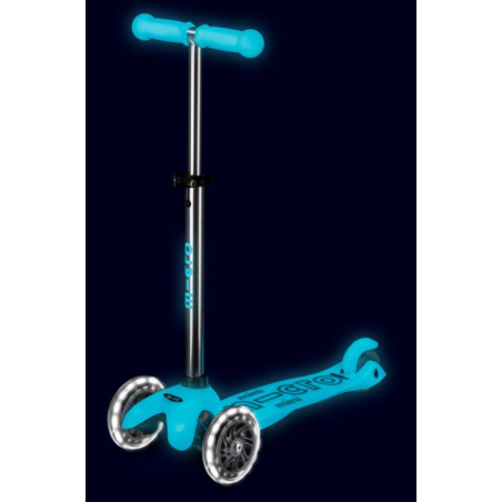 El Mini Micro ha sido elegido numerosas veces juguete del año por padres y madres. Este juguete deportivo no solo fomenta el movimiento y el ejercicio, sino que también ayuda a los niños a mejorar el equilibrio, la coordinación y las habilidades motoras finas. El manillar diseñado en forma de T hace más segura su conducción y dispone de un cierre de seguridad que hace que solo los adultos puedan desmontarlo para guardarlo. Dispone de un sistema de giro por inclinación patentado. La plataforma está fabricada con fibra de vidrio lo cual le otorga resistencia y flexibilidad. Además incluye letras de goma en relieve que son antideslizantes facilitando el manejo del patinete y dando seguridad extra a nuestros pequeños. Incorporan unas ruedas LED que funcionan a través de una dinamo, por lo que no requieren de baterías, sino que funcionan solo cuando nos movemos. Emiten una brillante luz blanca que, además de ser divertida para nuestros pequeños, les da seguridad al ser vistos con mayor facilidad en momentos de oscuridad. Por ultimo y en absoluta primicia, tanto la plataforma como los puños y el logo del manillar brillan en la oscuridad. La luz ultravioleta del ambiente diurno carga esos componentes y al llevarlos a la oscuridad hacen que el patinete que de dia tiene un tono pastel adquiera un tono neon brillante