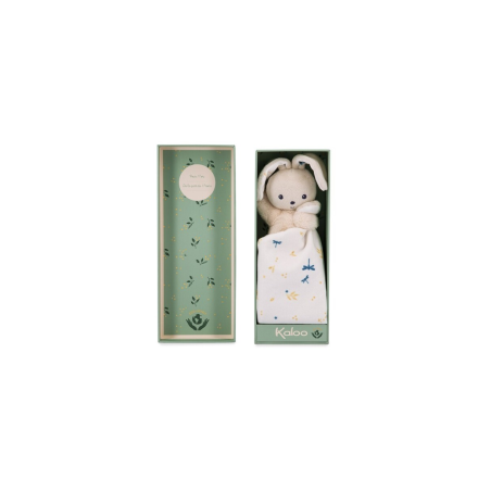 Este conejo envuelto en un aire de dulzura será el mejor compañero de tu bebé. Hecho con materiales y acolchado reciclados a partir de botellas de plástico, esta mantita es 100 % ecorresponsable. Con su pequeño cuerpo blandito de microterciopelo, el conejo es fácil de agarrar y sostener por el cuerpo o sus largas orejas. La mantita cuadrada que lleva en sus manos está cubierta de pequeñas libélulas que dan vueltas entre las ramitas doradas. Este delicado y poético estampado se encuentra en las orejas del conejo y realza el conjunto. Presentado en un hermoso estuche, este último se puede reutilizar como estuche de almacenamiento. Es la mantita perfecta para hacer un regalo 100 % «ecoencantador».