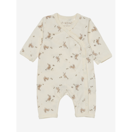 Mono suave y cómodo de FIXONI con estampado integral. El mono tiene efecto envolvente y se cierra con broches laterales hasta el tobillo. Canalé en muñecas, tobillos, cuello y a lo largo del cierre a presión. El mono está confeccionado en algodón orgánico con elástico. Certificado según según el ESTÁNDAR 100 según el certificado OEKO-TEX®. No. SH020 156011 TESTEX confianza en el textil.