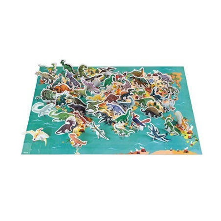 Puzle de cartón gigante de 200 piezas con la temática de los dinosaurios. El puzle incluye un libro educativo para descubrir los dinosaurios del mundo y aprender a conocerlos mejor. 50 dinosaurios de cartón para montar y colocar en el puzle. El nombre de los dinosaurios viene indicado en la parte trasera de cada figurita. Póster incluido.