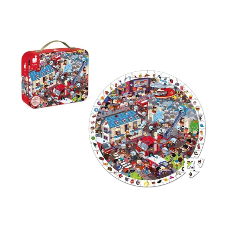 2 juegos en 1: un puzle sobre el tópico de los bomberos y un juego de observación. Una vez completado el puzle, el niño deberá encontrar los 51 objetos o ilustraciones que se muestran alrededor el puzle. Puzle redondo de 50 cm de diámetro. Contenido: un poster a utilizar como modelo. Número de piezas: 208. Materiales utilizados: cartón. Tipo de caja: bonito maletín redondo, fácil de transportar gracias a su asa. Diseñado en Francia. Este producto ha obtenido un premio Pal (galardón que distingue a aquellos juegos y juguetes que fomentan el desarrollo del lenguaje desde la edad más temprana).