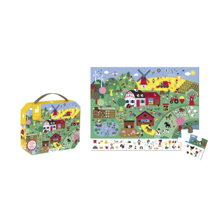 He aquí un bonito puzle de cartón de 24 piezas lujosamente ilustrado sobre el tema de la granja. El tamaño de las piezas está adaptado a las manos más pequeñas para facilitar el montaje del puzle. ¡Una vez que hayas terminado el puzle, diviértete buscando las 29 ilustraciones ocultas! Este práctico puzle se guarda en el interior del bonito maletín con asa para un transporte fácil y para no perder nunca las piezas. Fabricado en Francia. Cartón con certificación FSC y tintas vegetales.