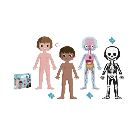 4 puzles gigantes sobre el cuerpo humano 1 puzle por ambas caras de 50 piezas niño/niña 1 puzle de 75 piezas sobre los órganos 1 puzle de 100 piezas fosforescentes sobre el esqueleto Los puzles tienen 1 metro de altura para ayudar a los niños a comprender mejor su cuerpo. El puzle incluye tarjetas educativas detalladas para conocer las distintas partes del cuerpo humano. Disponible en 12 idiomas: Francés, inglés, alemán, holandés, polaco, ruso, español, portugués, catalán, italiano, eslovaco y checo.