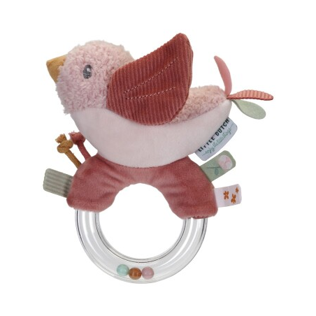¡Sujeta, gira y agita! Este sonajero con forma de pájarillo es un juguete divertido que disparará la curiosidad de tu bebé. Aletea sus rosas alas de pana o frota su suave barriga. El anillo transparente contiene 3 pequeñas cuentas de colores que empiezan a sonar cuando tu bebé juega con este divertido juguete. El sonajero mejora la coordinación mano-ojo y estimula los sentidos