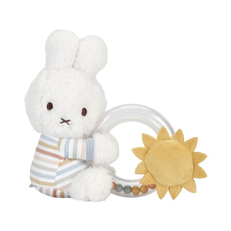 ¡Agarra, agita y acurrúcate! Esta suave y pequeña miffy sostiene un juguete divertido que hará los sonidos más dulces cuando lo muevas y lo agites. Miffy, vestida con Flores Vintage, un diseño de Little Dutch, te invita a jugar con el anillo sonajero y a acurrucarte con la florecita rosa. El anillo transparente contiene pequeñas cuentas que comienzan a sonar cuando tu bebé se mueve hacia arriba y hacia abajo y de un lado a otro. Un juguete clásico, perfecto para el parque, que potencia la coordinación ojo-mano y estimula los sentidos.