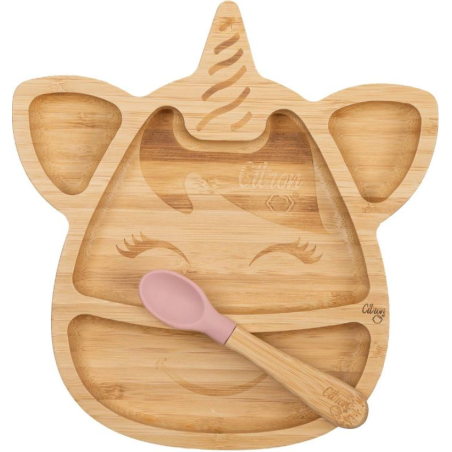 PLATO DE BAMBU CON VENTOSA Y CUCHARA UNICORNIO CITRON